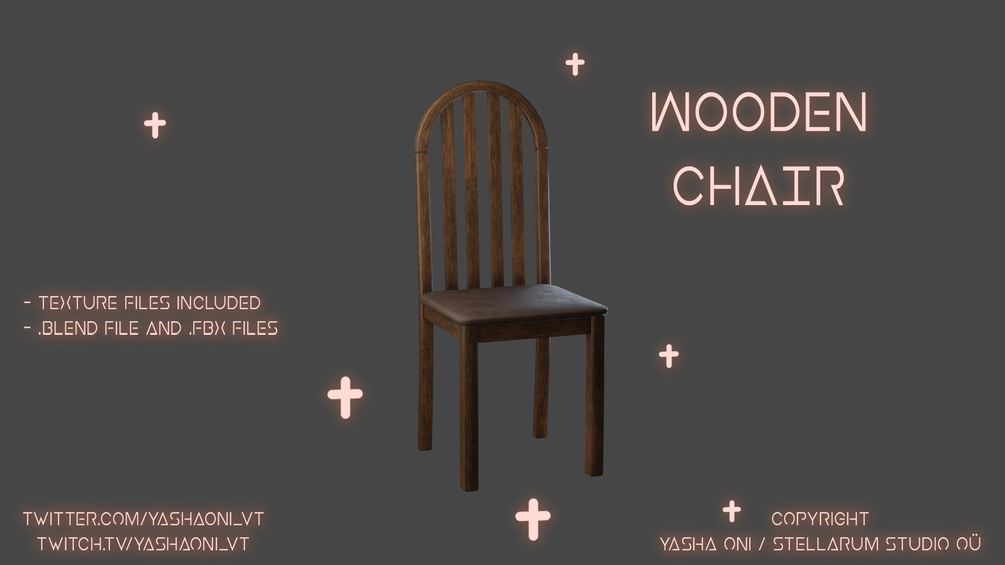 Simple chair for any environment <3 Shaders: Poiyomi Toon 8.1 - Texture files included - .blend, .fbx and Unitypackage files TOS: DO NOT RESELL under any circumstances DO NOT claim as your own DO NOT take credit for the assets DO NOT share the asset files DO NOT use on models to sell --- Commercial use OK ! (Using on models to stream with, content creation etc.) DO give credit when assets are used to the original creator (@YashaOni_VT Twitter / Booth link) FEEL FREE to edit the texture colours in any way! Please enjoy the assets! β