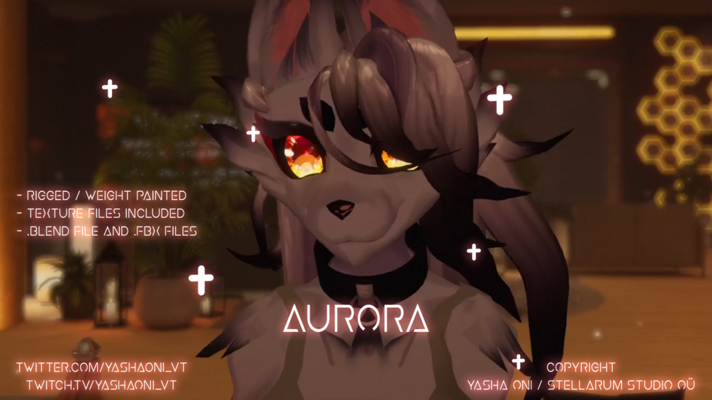 Aurora <3 VRCHAT READY VTUBING READY (VSeeFace / VNyan) (NSFW ver. of the video https://www.youtube.com/watch?v=1wsqQxSnDUc) Please use Poiyomi shaders! Make sure you have VRCSDK already imported in your unity project before importing the unitypackage file!! - Rigged / weight painted - Texture files included - .blend, .fbx, .vsfavatar and Unitypackage files TOS: DO NOT RESELL under any circumstances DO NOT claim as your own DO NOT take credit for the assets DO NOT share the asset files DO NOT use on models to sell --- Commercial use OK ! (Using on models to stream with, content creation etc.) DO give credit when assets are used to the original creator (@YashaOni_VT Twitter / Booth link) FEEL FREE to edit the texture colours in any way! Please enjoy the assets!
