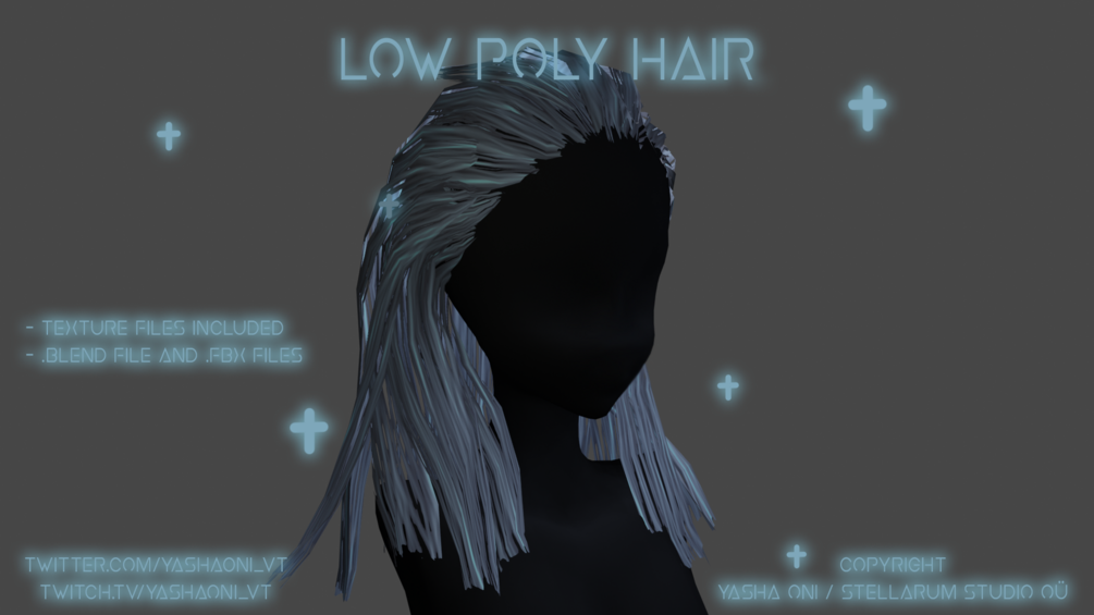 Low-poly hair - Texture files included / (number) colours (name colours) - .blend, .fbx and Unitypackage files TOS: DO NOT RESELL under any circumstances DO NOT claim as your own DO NOT take credit for the assets DO NOT share the asset files DO NOT use on models to sell --- DO give credit when assets are used to the original creator (@YashaOni_VT Twitter / Booth link) FEEL FREE to edit the texture colours in any way! Please enjoy the assets! β