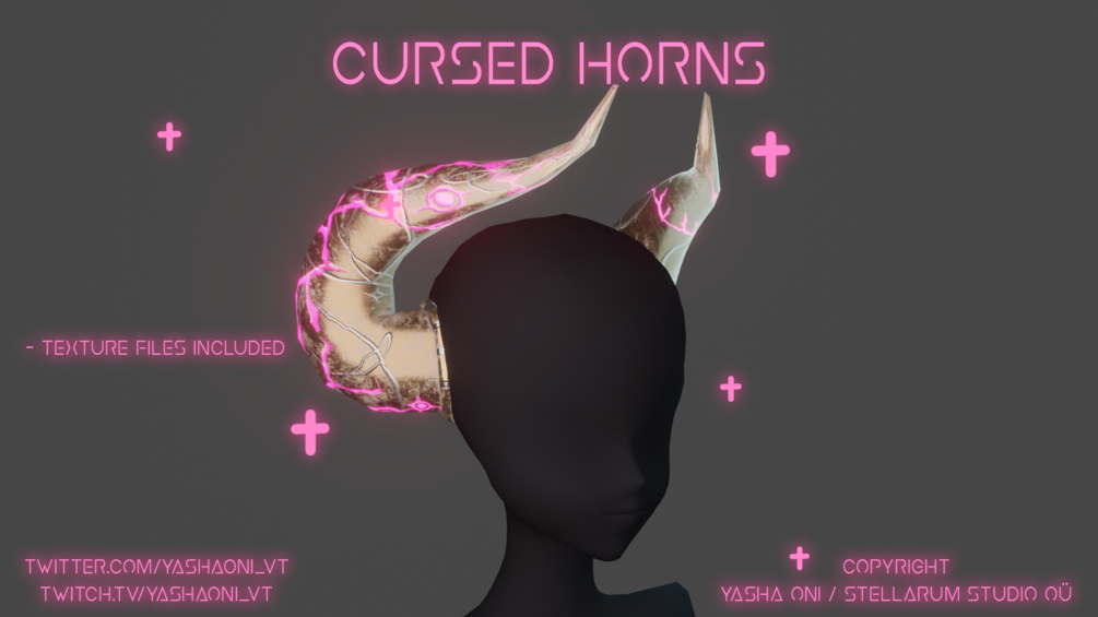 Cursed horns - Texture files included - 2 versions - .blend, .fbx and UnityPackage files TOS: DO NOT RESELL under any circumstances DO NOT claim as your own DO NOT take credit for the assets DO NOT share the asset files DO NOT use on models to sell --- DO give credit when assets are used to the original creator (@YashaOni_VT Twitter / Booth link) FEEL FREE to edit the texture colours in any way! Please enjoy the assets! β