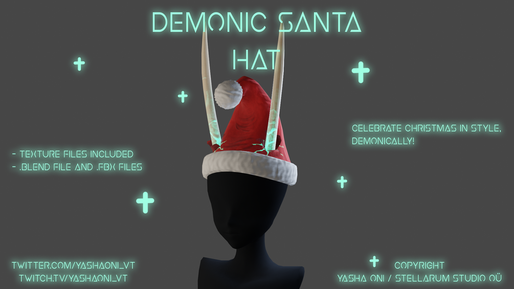 Spooky Demonic Xmas bundle! Also available seperately <3 - Rigged / weight painted - Texture files included - .blend, .fbx and Unitypackage files TOS: DO NOT RESELL under any circumstances DO NOT claim as your own DO NOT take credit for the assets DO NOT share the asset files DO NOT use on models to sell --- Commercial use OK ! (Using on models to stream with, content creation etc.) DO give credit when assets are used to the original creator (@YashaOni_VT Twitter / Booth link) FEEL FREE to edit the texture colours in any way! Please enjoy the assets! β