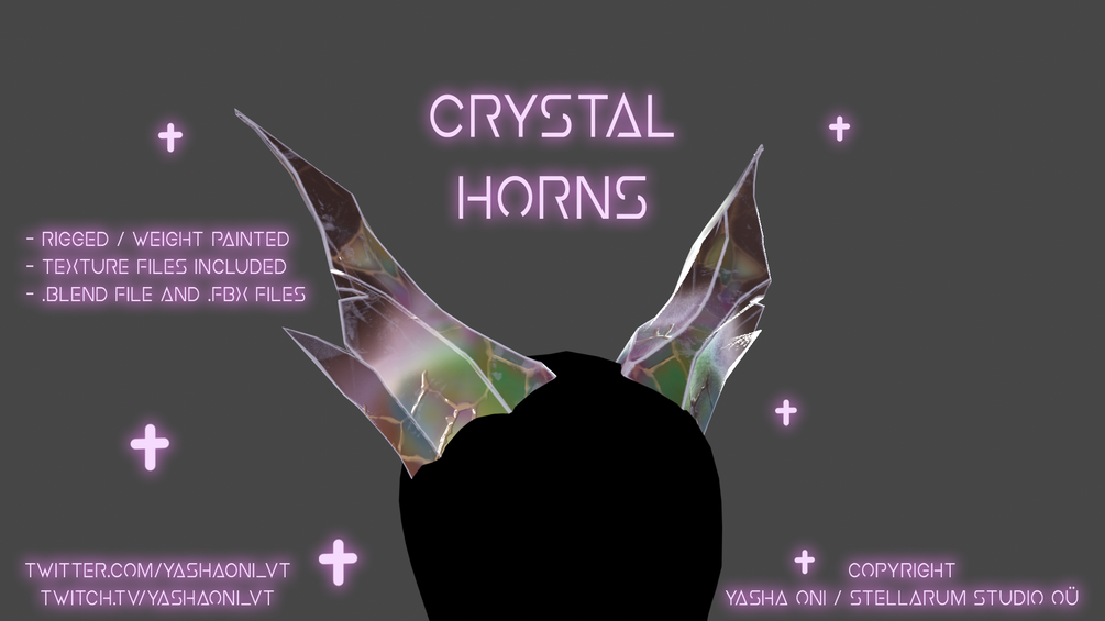 Crystal Horns! - Texture files included - .blend, .fbx and Unitypackage files TOS: DO NOT RESELL under any circumstances DO NOT claim as your own DO NOT take credit for the assets DO NOT share the asset files DO NOT use on models to sell --- Commercial use OK ! (Using on models to stream with, content creation etc.) DO give credit when assets are used to the original creator (@YashaOni_VT Twitter / Booth link) FEEL FREE to edit the texture colours in any way! Please enjoy the assets! β
