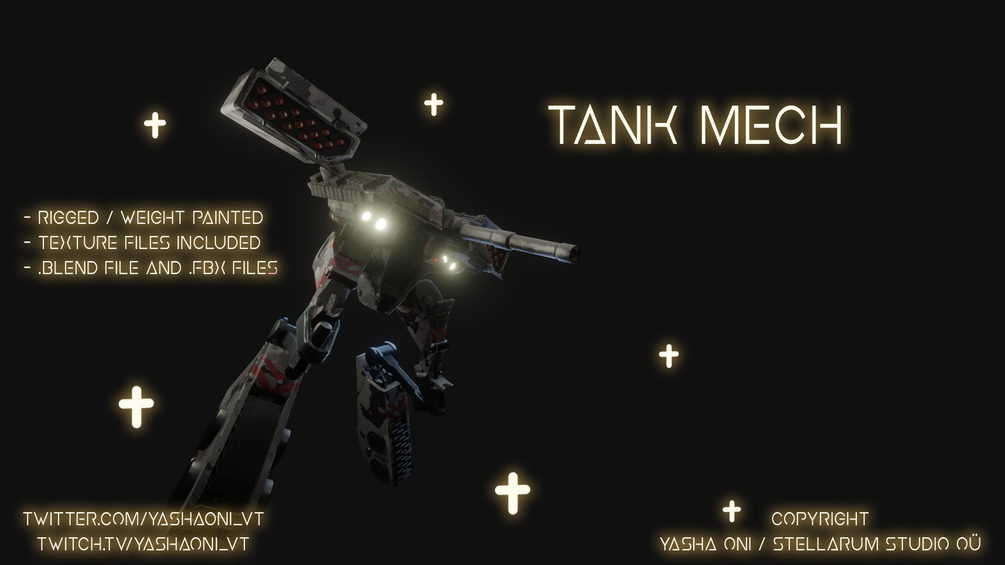 Tank Mecha! - Rigged / weight painted - Texture files + materials included - .blend, .fbx and Unitypackage files - ANIMATIONS IN .blend FILE ONLY! Will update the item here once I figure out how to import the animations into unity! TOS: DO NOT RESELL under any circumstances DO NOT claim as your own DO NOT take credit for the assets DO NOT share the asset files DO NOT use on models to sell --- Commercial use OK ! (Using on models to stream with, content creation etc.) DO give credit when assets are used to the original creator (@YashaOni_VT Twitter / Booth link) FEEL FREE to edit the texture colours in any way! Please enjoy the assets! β